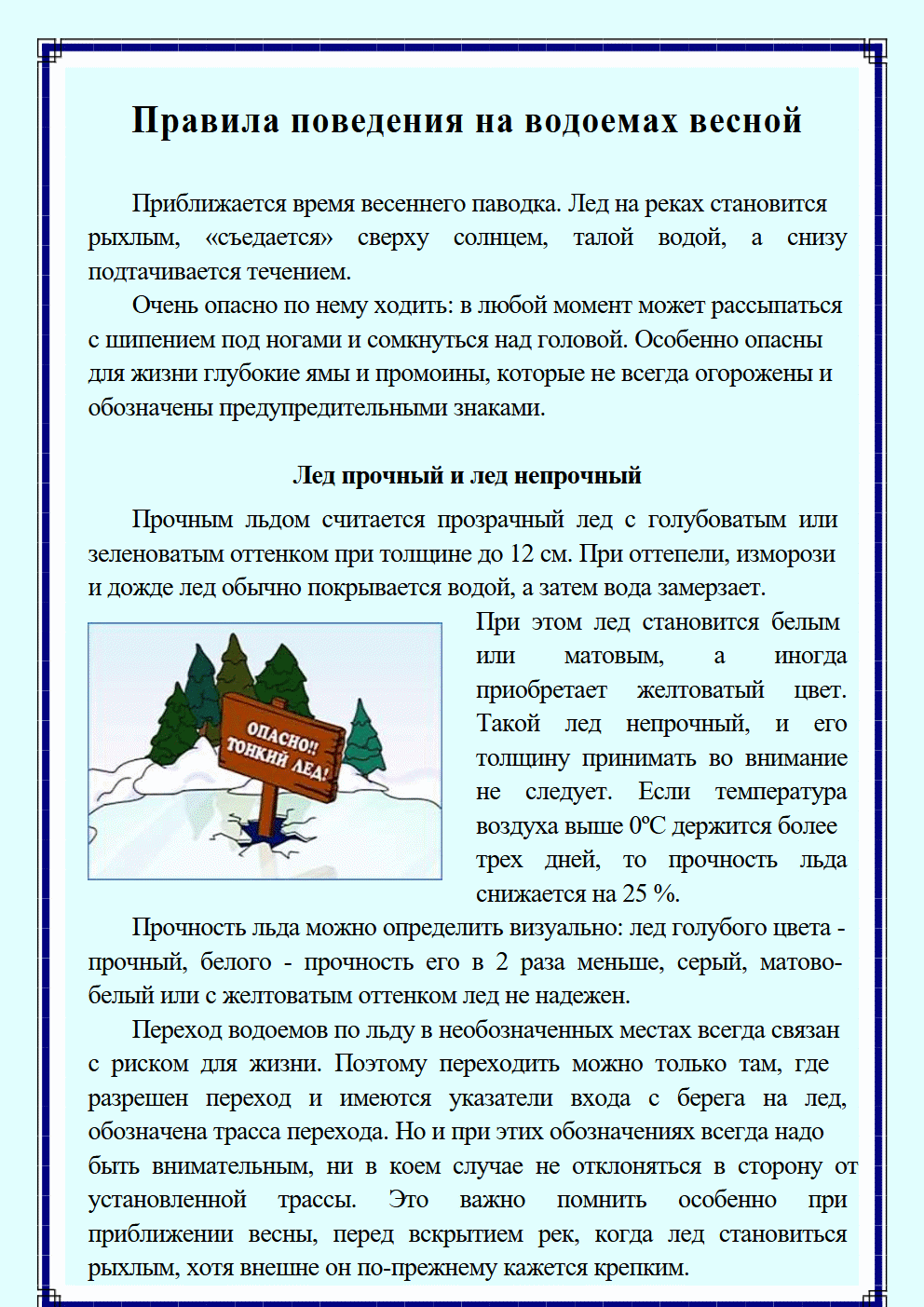 ВАЖНО ПОМНИТЬ! Безопасным для человека считается лед, толщиной не менее 10 см. Причем, течение воды ослабляет лед: подводные ключи, сточные воды, в местах произрастания растительности. При повышении температуры окружающего воздуха прочность льда уменьшается, так, если температура выше 0 держится в течение 3 дней, то прочность льда уменьшается на 25%.